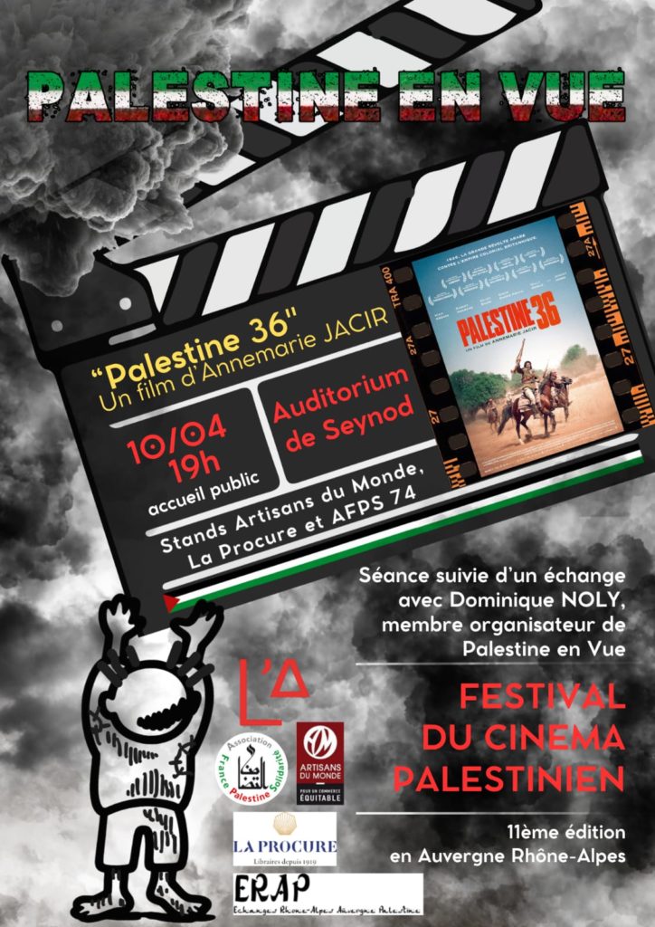 Publié par gfumex le 8 Avr 2026 dans Annonces, Droits humains, Local | 0 commentaire Vendredi 10 avril à 20h : séance présentée par Dominique Noly, membre organisateur de Palestine en vue, en partenariat avec l’Association France Palestine Solidarité 74. Palestine 36 (VOST) Palestine, 1936. La grande révolte arabe, destinée à faire émerger un État indépendant, se prépare alors que le territoire est sous mandat britannique.
