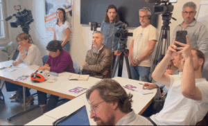 Dans les locaux syndicaux du 6 rue des Terreaux du Temple à Genève, une conférence de presse organisée par les représentants du collectif NOG7 s’est tenue avec la présence d’une quinzaine de journalistes représentant la presse genevoise et nternationale avec la présence su média ”Associated presse”.