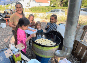Grâce aux différentes sources de financement, les salariés du cri de l’œuf assurent la préparation de repas au pied d’immeubles pour sensibiliser la population à une alimentation saine, et une présence bienveillante auprès des enfants dans le terrain d’aventures :