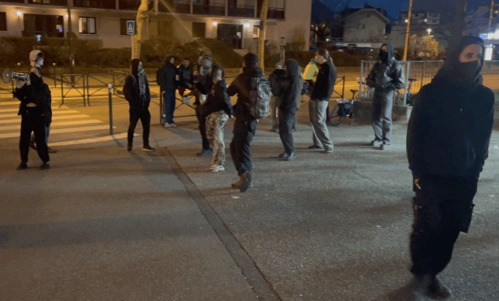 Dès 18H30, une vingtaine de jeunes, munis d’un mégaphone, ont lancé des slogans antifacistes en direction de la salle Eau et forêt où 170 personnes assistaient à la réunion de la liste annécienne d’extrême droite RN/UDR.