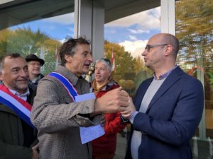 Pierre Janot, conseiller régional Vert remet la lettre « On a perdu la flamme » au directeur de la communication du CIO