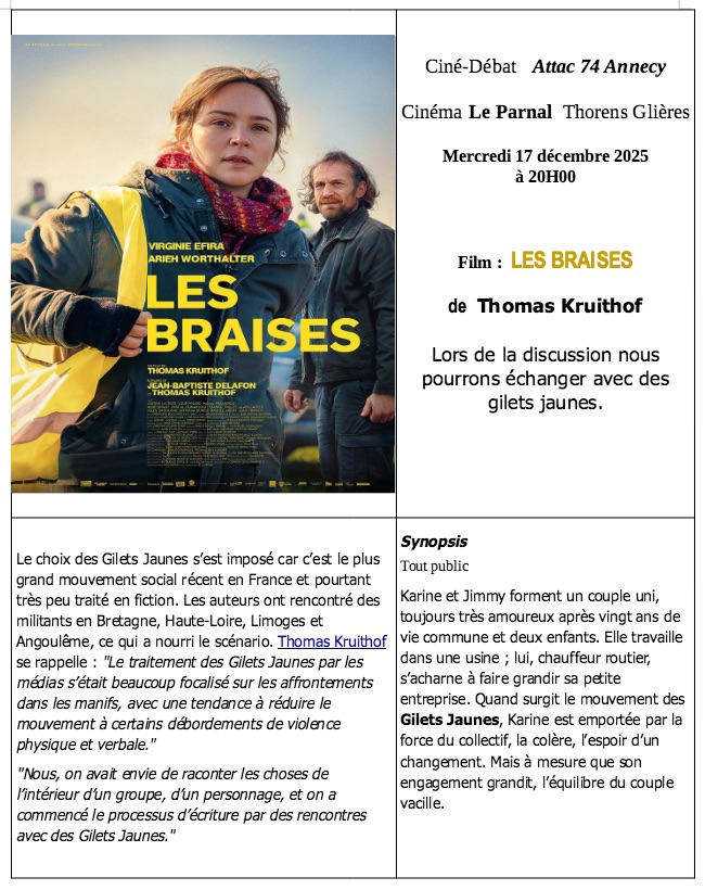 Mercredi 17 décembre venez partager les braises des gilets jaunes au cinéma le Parnal