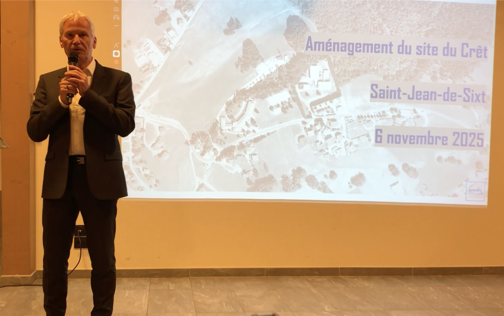 En quinze minutes, le représentant de la SOLIDEO Alpes 2030[1], Simon d’Annunzio, directeur de la supervision et des villages, expose les grandes orientations du projet et les intentions d’aménagement : « Le site du Crêt est un site qui nous paraît tout à fait adéquat pour l’accueil du village olympique de Haute-Savoie. (…) Déjà urbanisé, il accueille déjà des constructions et il est pour bonne partie artificialisé et situé entre les sites des épreuves olympiques, le Grand-Bornand (Biathlon) et La Clusaz (ski de fond). »