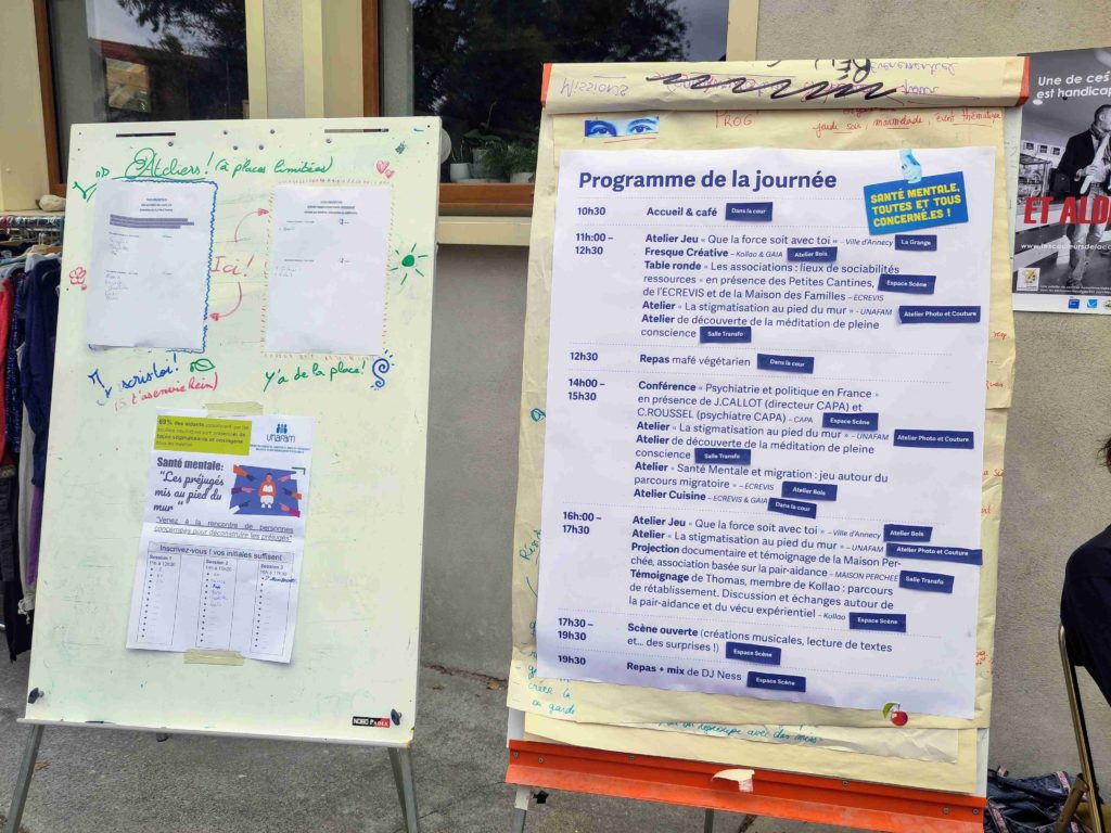 Alors il est visiblement grand temps de se retrousser les manches pour que tout le monde puisse s’emparer de ce sujet, ce qui est tout l’objet de la journée de réflexion de ce samedi organisée par KOLLAO[6], l’UNAFAM[7], Gaia SAMSAH le Bilboquet[8] et l’ECREVIS en partenariat avec la ville d’Annecy. Ateliers, fresques, projection de documentaire et témoignages sont prévus tout au long de la journée.