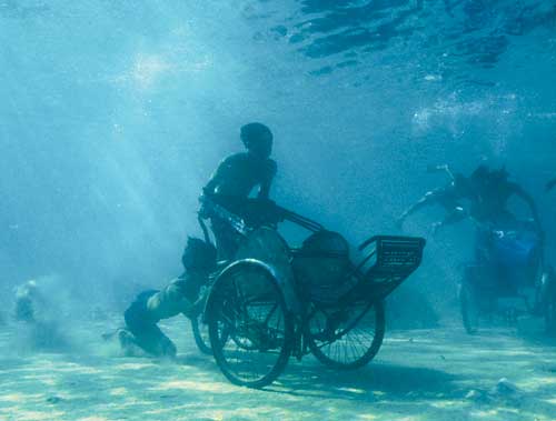 Les origines (japonais/vietnamien) de l’artiste (né en 1968 à Tokyo), qui vient spécialement d’Ho Chi Minh Ville à Annecy, présenter sa recherche, n’oublie pas son lieu de vie et de travail, le Vietnam, ni l’histoire de ce pays au XX° siècle, son passé marqué par les guerres et les boat people. L’œuvre de l’artiste est avant tout un magnifique travail plastique…aussi pour ceux et celles qui veulent aller plus loin dans son appréhension, ils retrouveront le dragon de la fête du têt (nouvel an vietnamien) avec “happy new year” et les conducteurs de cyclos avec “nah trang…” réalisant une course improbable dans les profondeurs marines